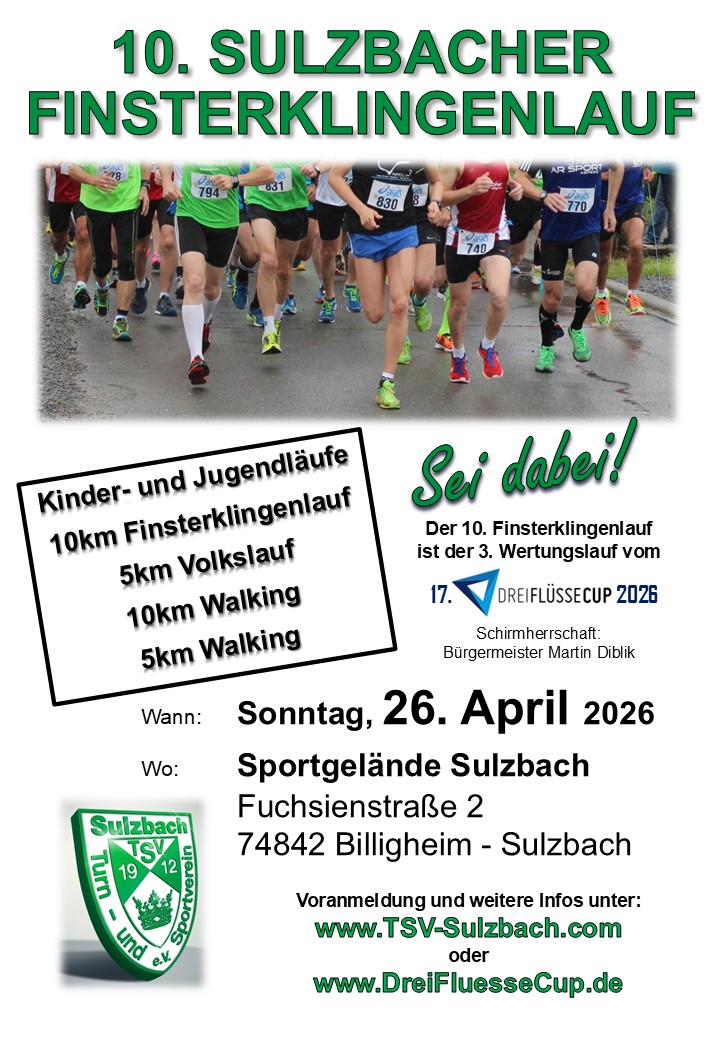 am 26.04.2026 der 10. Finsterklingenlauf statt. Dieser Volkslauf ist einer von 6 Wertungsläufen für den Drei-Flüsse-Cup. Start ist ab 9:30 Uhr und gestartet werden kann in auf folgenden Strecken: